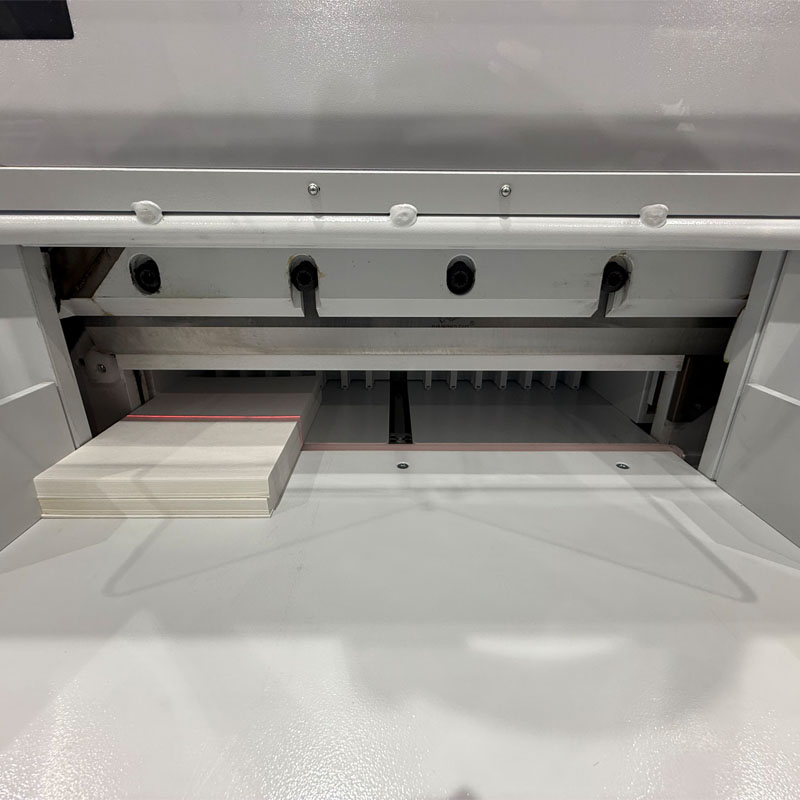 Similarly, the Ideal Safety Cutting System (SCS) is employed to ensure absolute reliability in cutting and includes an interlocking transparent safety guard at the front while a fixed steel cover protects the rear of the guillotine.