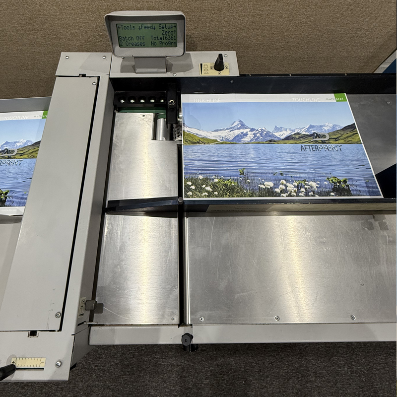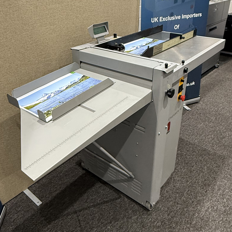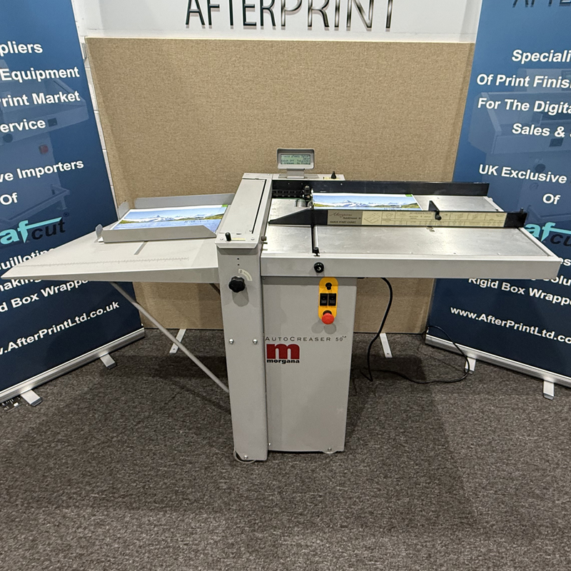 AfterPrint have available this 2nd user Morgana AutoCreaser 50, an advanced automatic creasing (creasing/creasing-and-perforating) machine designed for professional print-finishing. The machine is intended for handling digitally or lithographically printed sheets — especially coated paper, card, laminated stock or cross-grained stock — and creasing them cleanly for folding, without damaging or cracking the fibres.