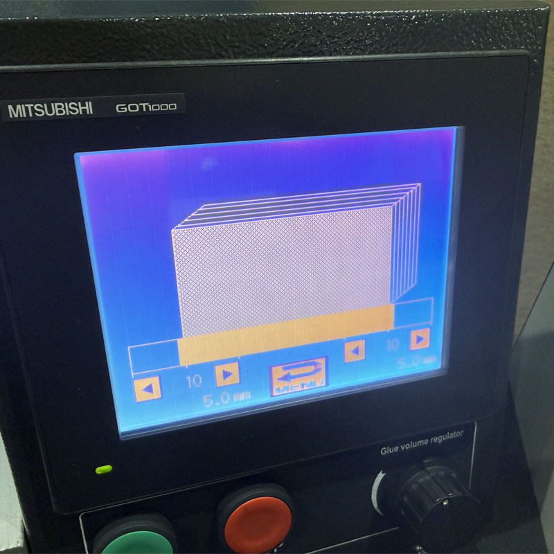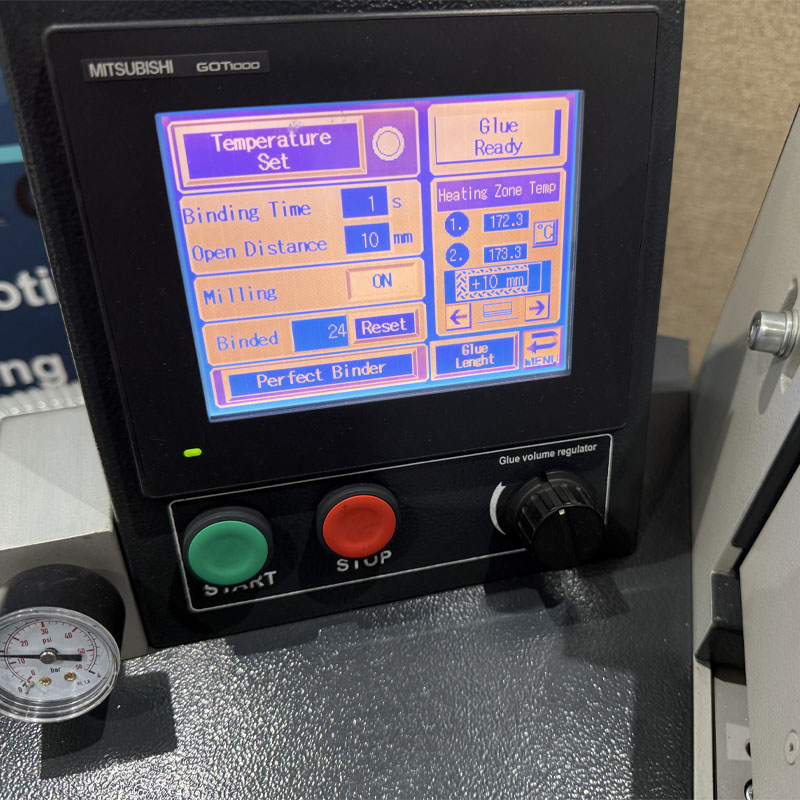 The system is easy to use and actively reduces the skill level required for PUR binding. Firstly, calibrated adjustment dials allow fast and intuitive setup of the nozzle size to match the book block. Simultaneously, automated systems accurately measure the spine length. As a result, the Lamibind automatically sets the glue application length to the same specification. In addition, operators can fine-tune both the book block positioning and the glue start/stop positions for even greater accuracy. Furthermore, the orbital nozzle application system delivers a precise and consistent quantity of glue to the spine and book sides. Finally, nipping pressure and cover application dwell times are easily adjustable via the touchscreen, giving operators total control at their fingertips